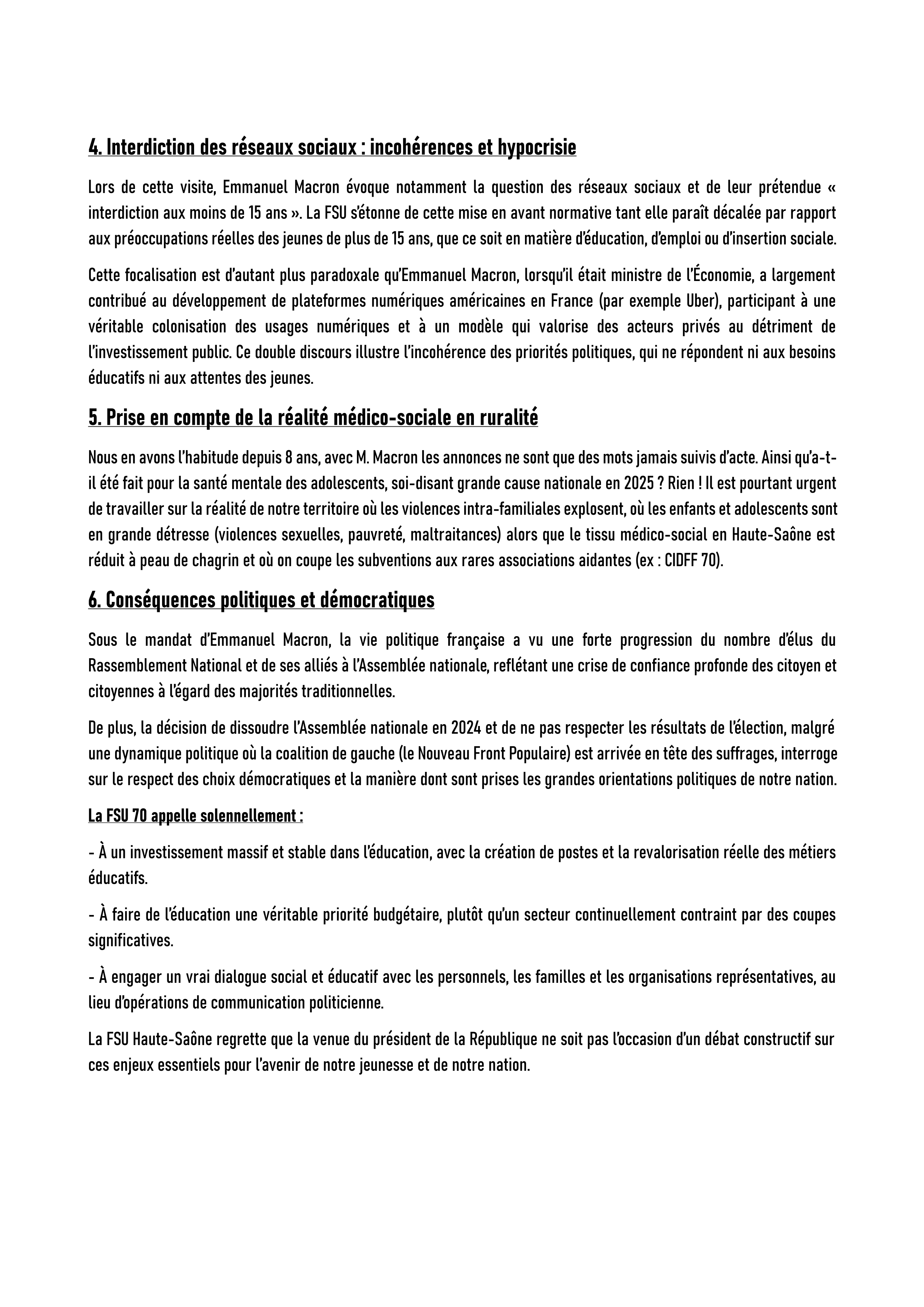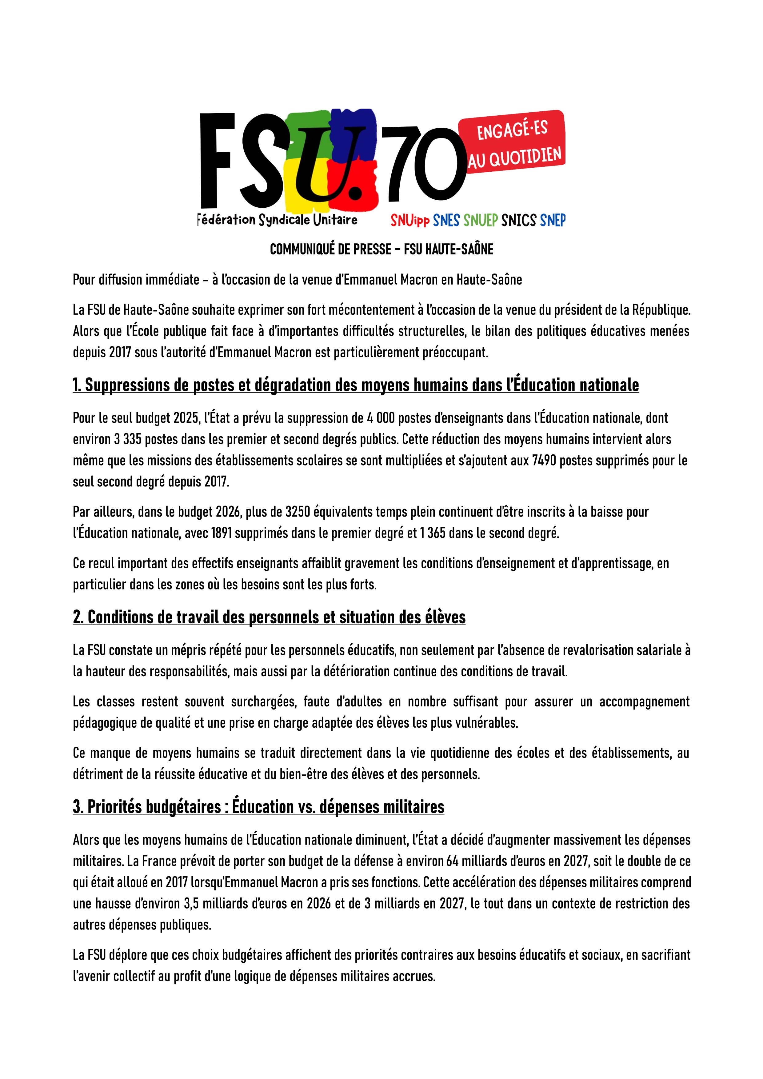 Vous êtes ici : Accueil Sections départementales SNES 70 (Haute-Saône) Emmanuel Macron en Haute-Saône - Communiqué de presse de la FSU 70 3 février 2026 Sections départementales Emmanuel Macron en Haute-Saône - Communiqué de presse de la FSU 70 Imprimer l'article