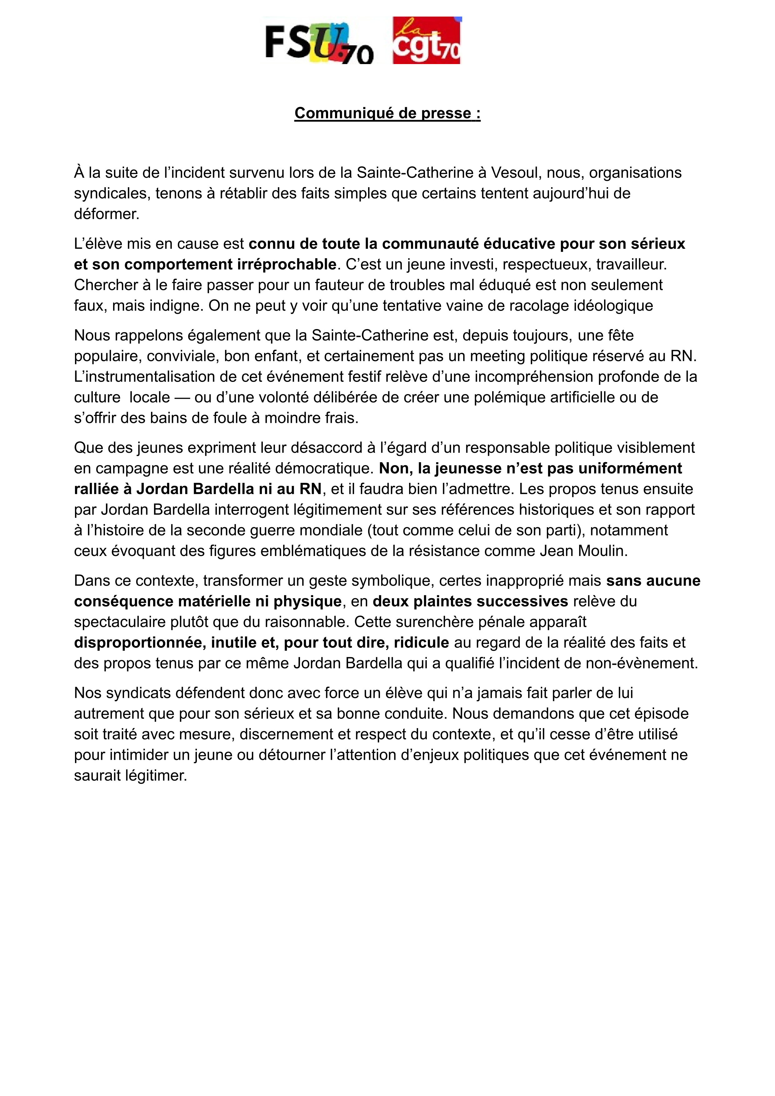 Vous êtes ici : Accueil Actualités Le point sur ... Incident lors de la sainte Catherine à Vesoul : disproportion et spectacle ! 5 décembre 2025 Actualités Incident lors de la sainte Catherine à Vesoul : disproportion et spectacle ! Imprimer l'article