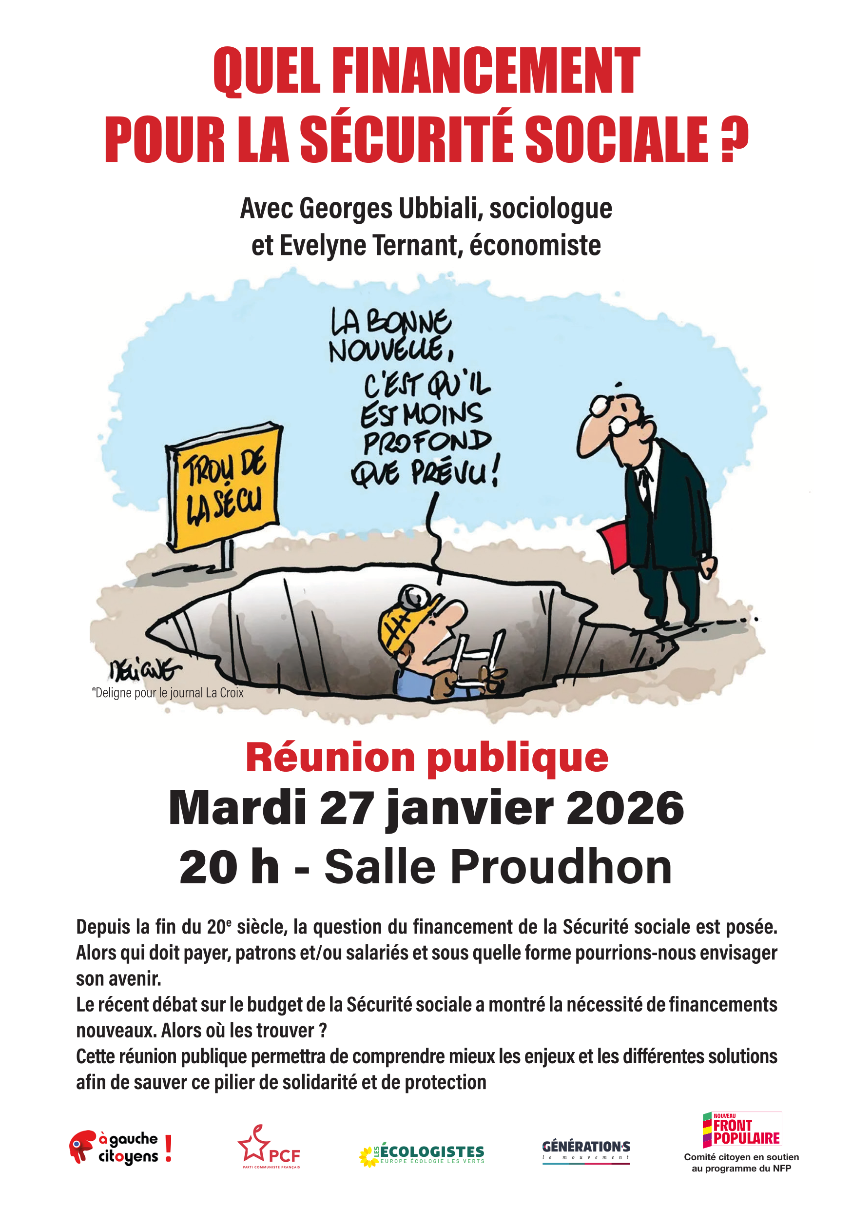 Vous êtes ici : Accueil Actualités Actualité culturelle et militante QUEL FINANCEMENT POUR LA SÉCURITÉ SOCIALE ? Réunion publique, mardi 27 janvier 2026 20 h - Salle Proudhon 16 janvier 2026 Actualités QUEL FINANCEMENT POUR LA SÉCURITÉ SOCIALE ? Réunion publique, mardi 27 janvier 2026 20 h - Salle Proudhon Imprimer l'article